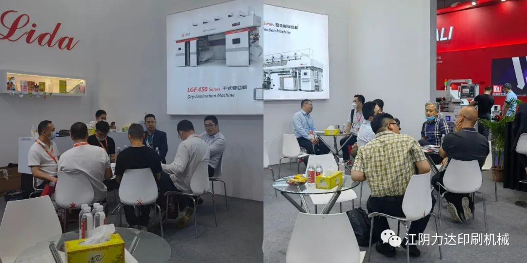 在“碳中和”、“碳達峰”、“限塑令”升級下的橡塑行業,發展循環經濟、節能減排等正當其時。這不僅僅是各界熱議的話題與挑戰,更暗藏著巨大的新市場、新機遇,眾多新能源、5G、新材料等企業聞訊而來。開展四天來,許多觀眾紛紛來到展臺進行商務洽談,其中公司最新研發的LDF 450型多功能復合機以及LGF 450型干式復合機收到了客戶的廣泛關注,咨詢客商不斷。該機型最高機械速度為450m/min,支持無溶劑、網線輥、半柔版、定點涂布等多種涂布方式,實現一機多用,為客戶節約更多的成本,實現更高的經濟效益。